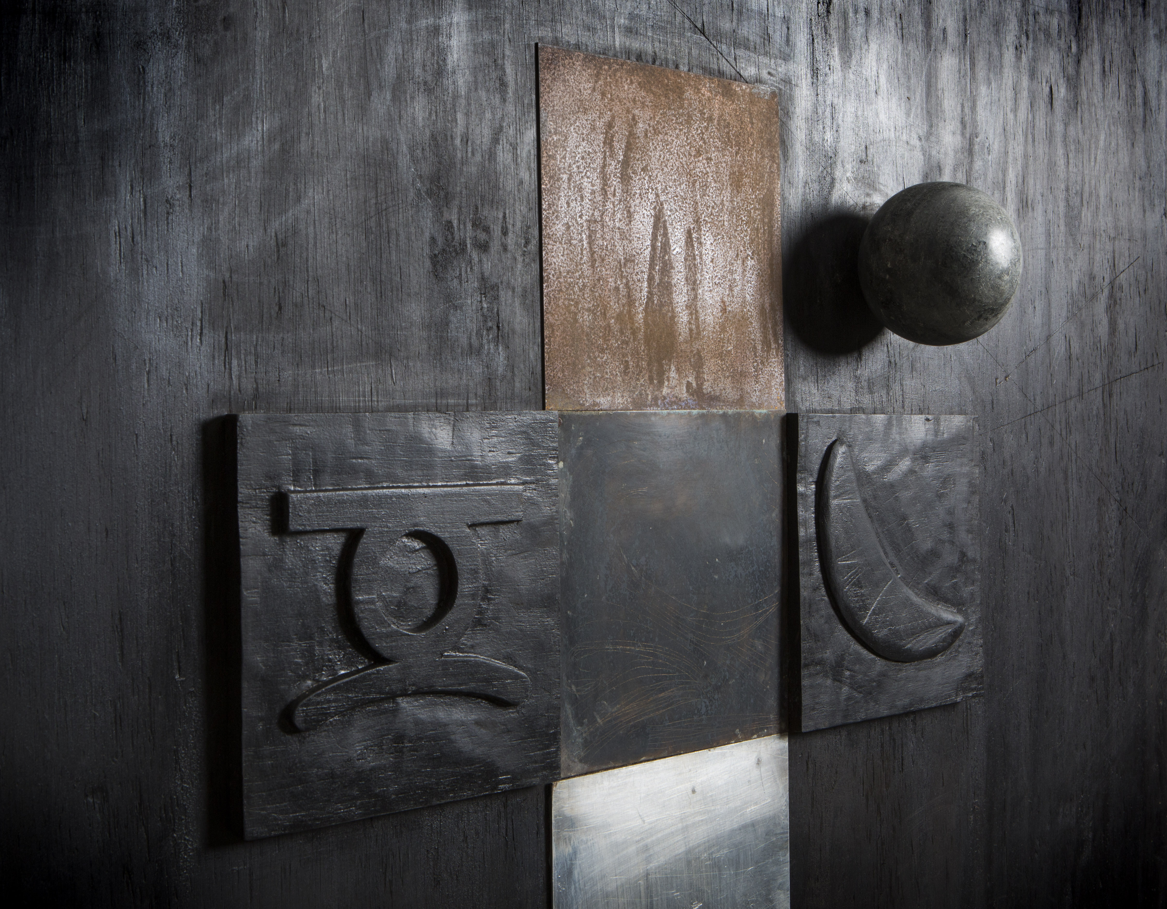 Esta individual na Paulo Darzé Galeria emerge dessa aprendizagem. Em obras como Pedra em Travessia, blocos de pedra- -sabão escarificada equilibram-se sobre ferro oxidado – a pedra mineira atravessando o metal que um dia foi corrente, que um dia foi grade. Geologia Baiana e Geologia Mineira inscrevem nas superfícies uma cartografia íntima: as duas terras que formam o artista gravadas como códigos de origem. Magia dos Mercados entrelaça troncos de madeira com correntes naúticas e ferramentas laborais – o mercado ancestral africano convocado através de seus instrumentos de trabalho, não de seus produtos.