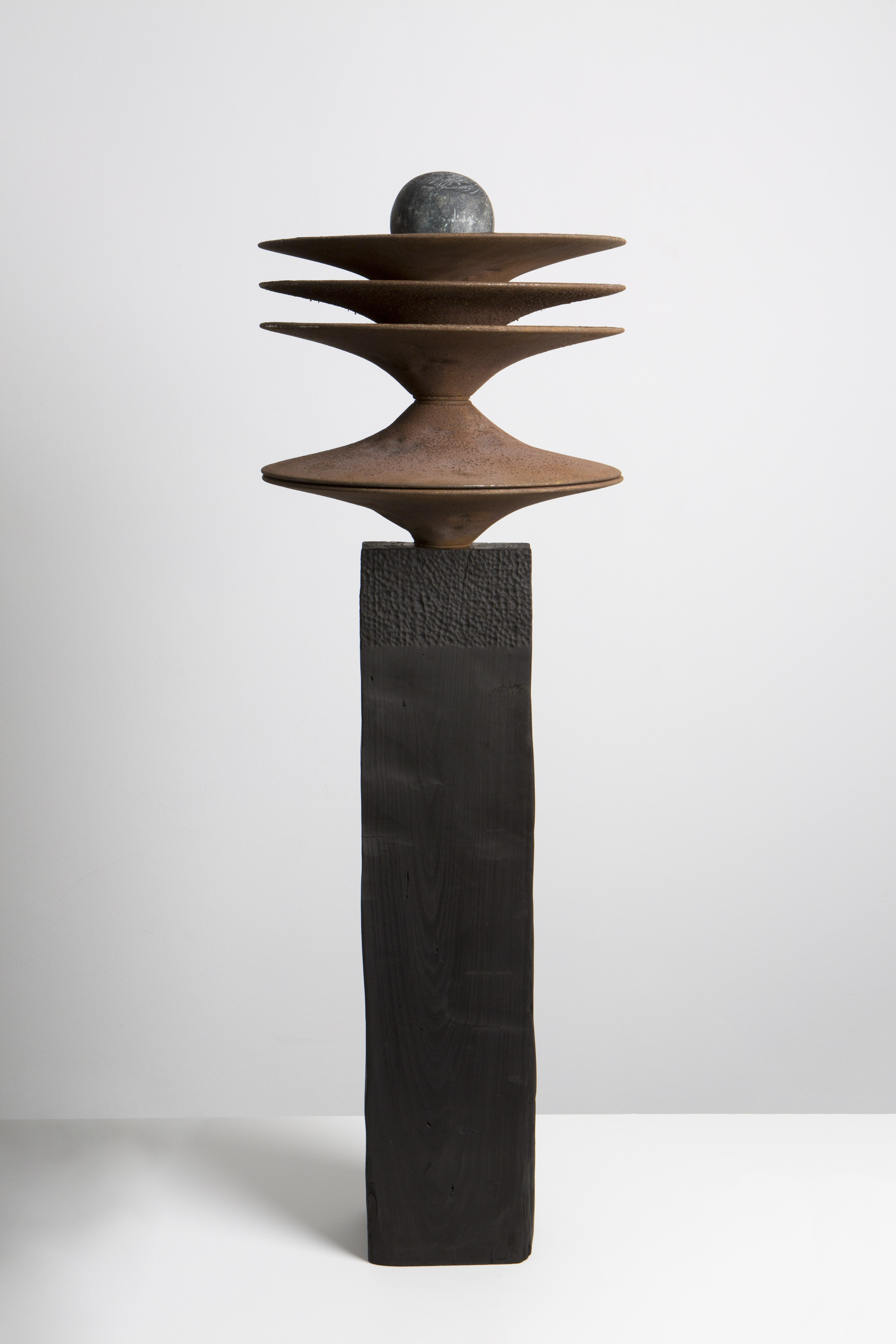 Seu vocabulário material é político porque carrega as mãos que o trabalharam. Conversando com Daniel no ateliê, me veio à cabeça um poema clássico de Bertolt Brecht, Perguntas de um Trabalhador que Lê1: “Quem construiu Tebas de sete portas? / Constam nos livros os nomes dos reis; / terão os reis arrastado os blocos de pedra?”. Pedra-sabão, ferro oxidado, madeira carbonizada, couro, piche – cada matéria traz inscrita a história de quem a extraiu, moldou, queimou, curtiu.