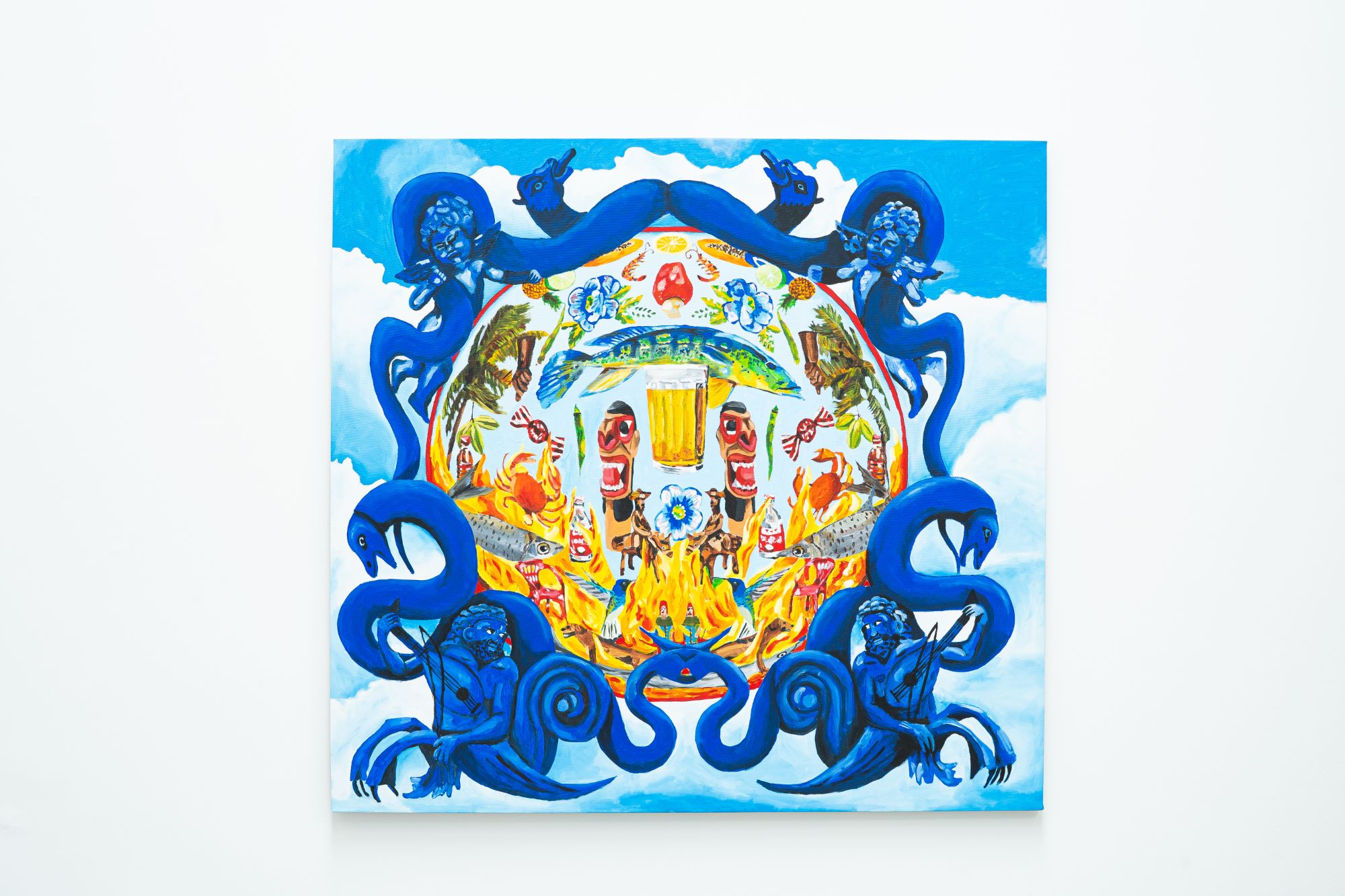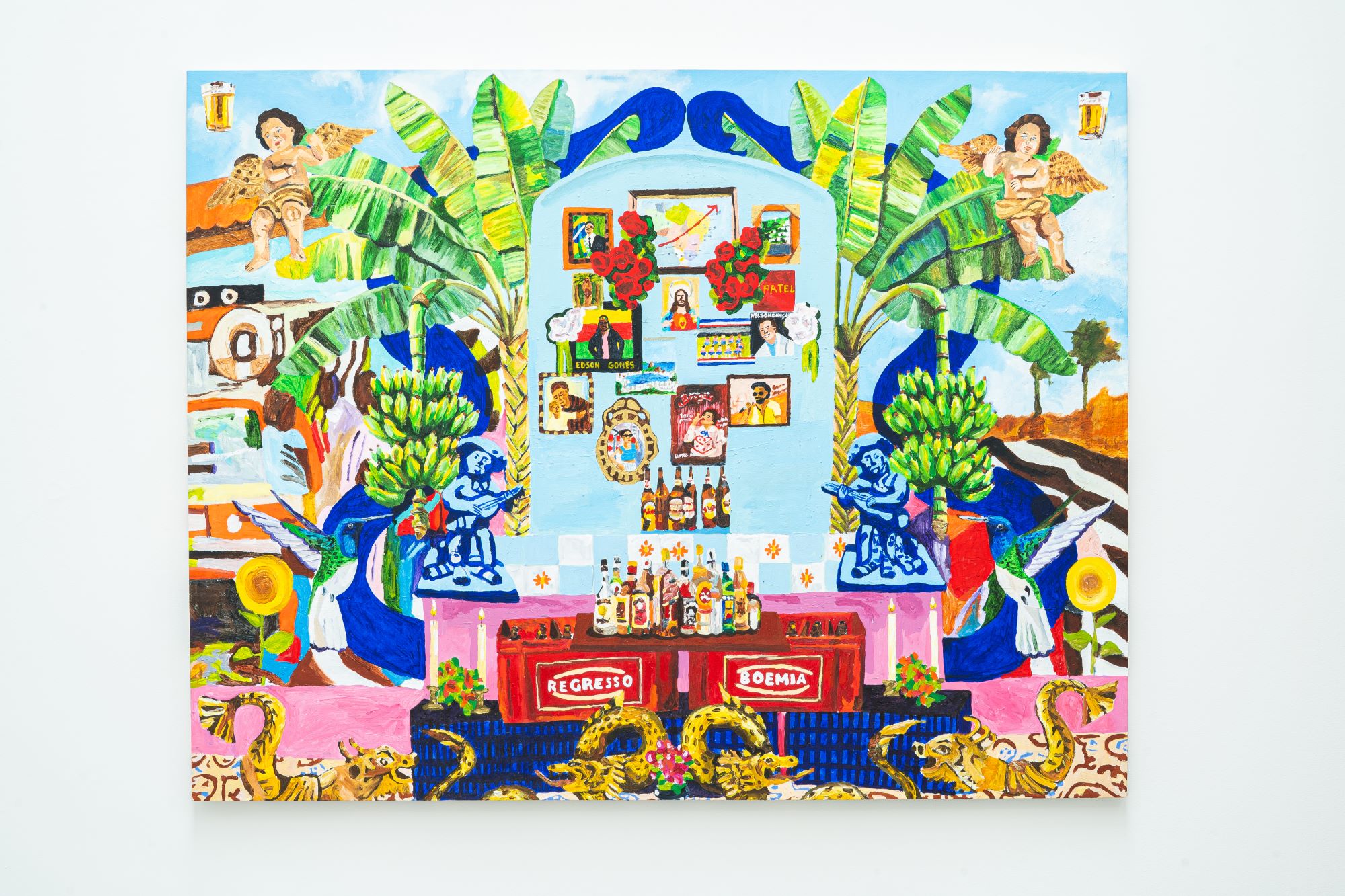 Acredito que toda arte seja uma espécie de cartografia onde o artista mostra um pouco do mundo que enxerga e do mundo que vê. E essa exposição não é diferente, circulando muito entre Salvador e o Recôncavo Baiano, e outros lugares da Bahia, além da circulação imaginária dos lugares que sonho; trago um pouco da representação de cada lugar, pensando na forma cotidiana, onde as pessoas consigam se identificar com os lugares, símbolos e pequenos ritos. Trago uma obra onde se tem um altar bar, em que cartografo esta experiência singular que é estar cercado por tantas bebidas e também por figuras santas, onde o sagrado não se tem limite diante da experiência da embriaguez. Faço a fabulação de novos mundos, a partir destes universos tão ricos, mas como disse anteriormente, quem vai finalizar toda essa fabulação é o expectador que vai emergir na obra junto às minhas e as suas memórias, tornando assim a obra coletiva