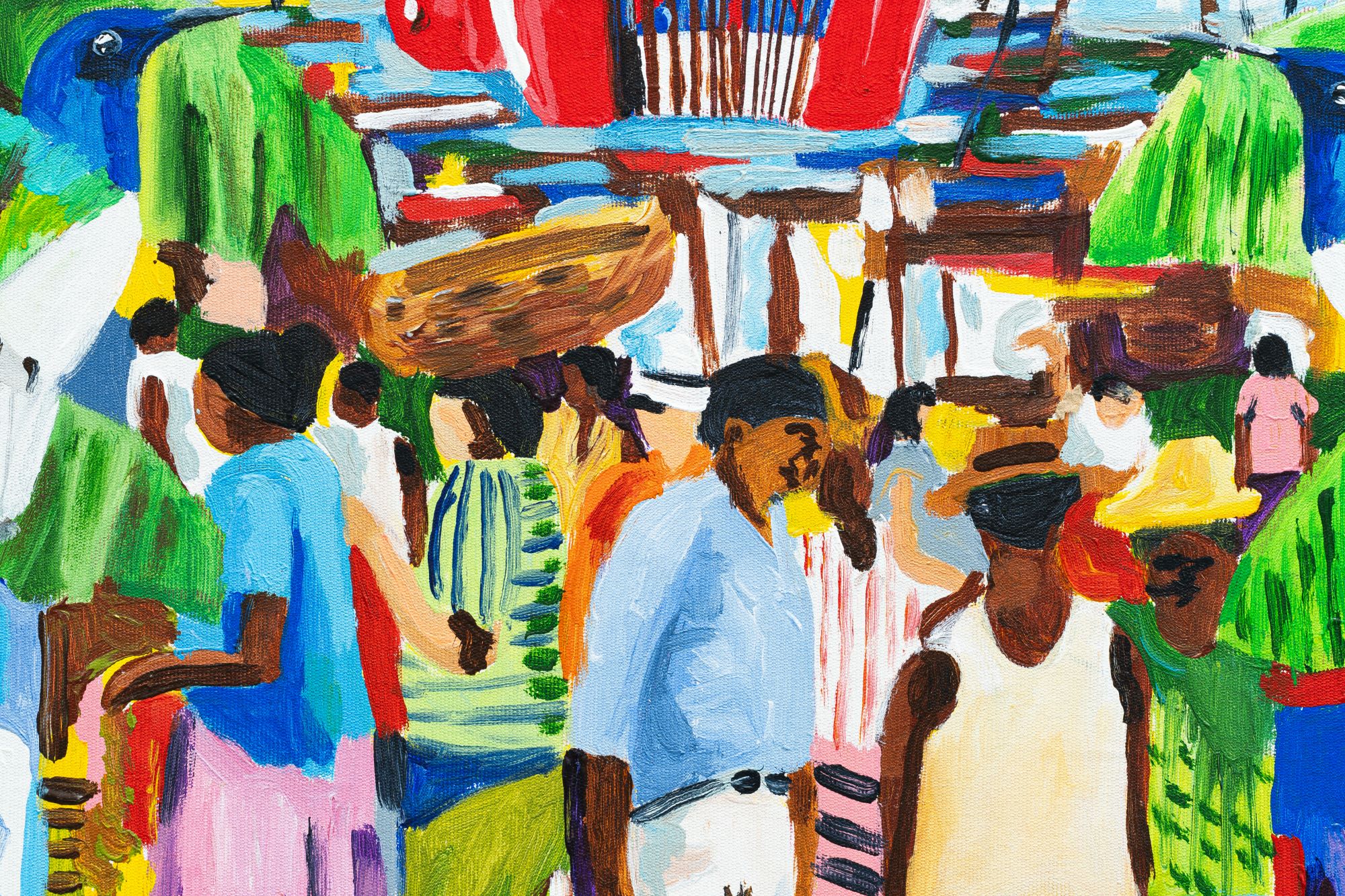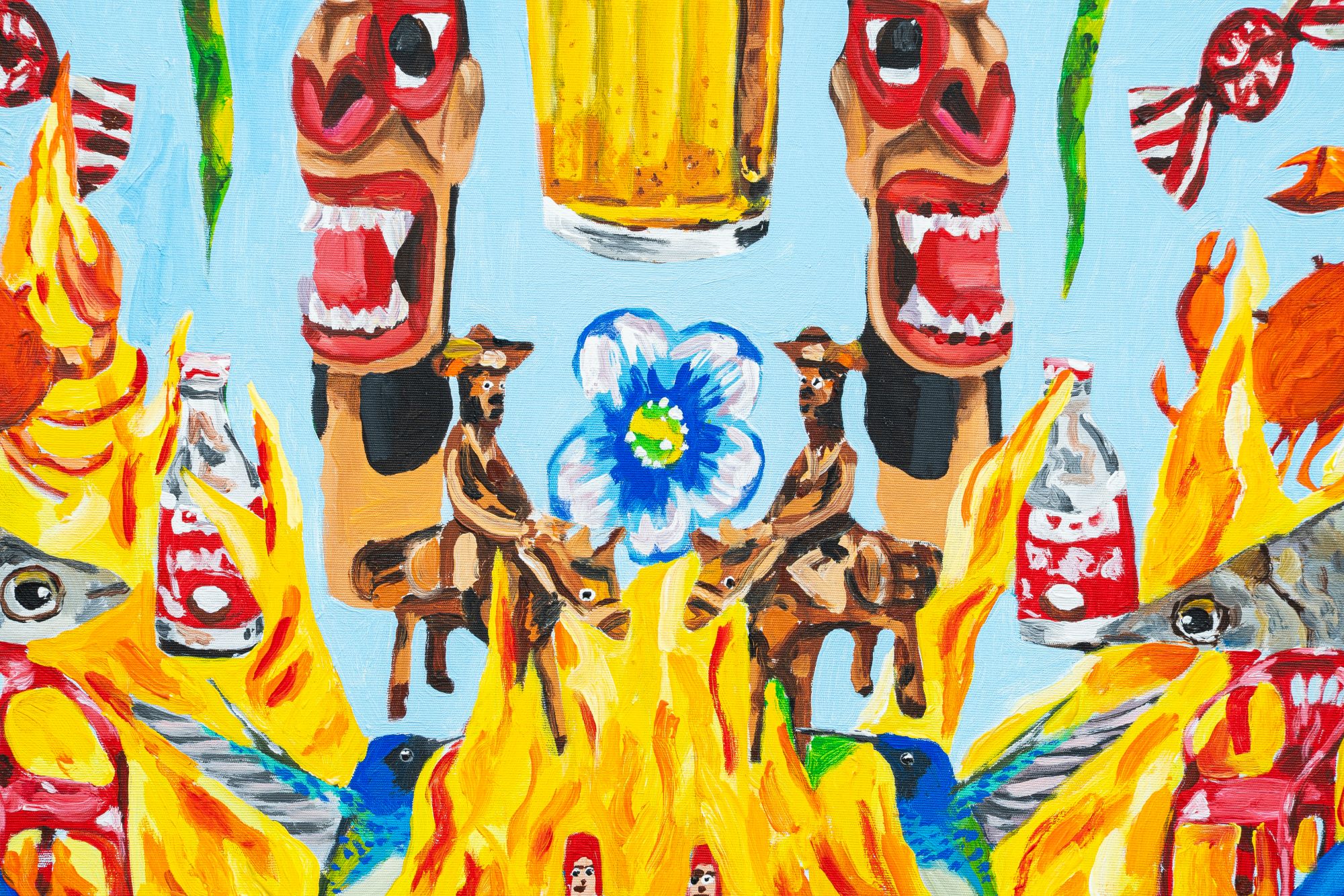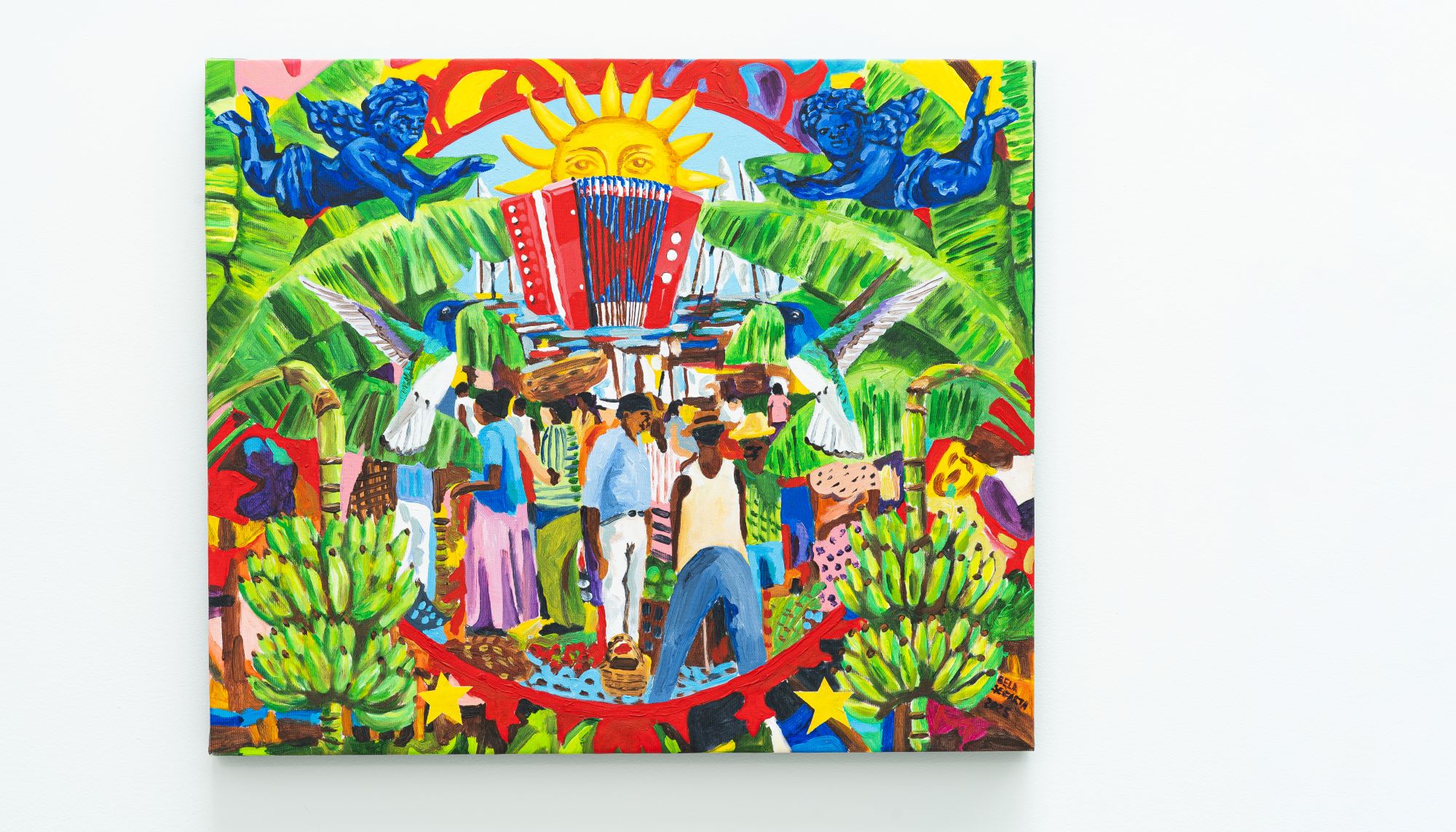 O acúmulo e o excesso de figuras, recorrentes em suas pinturas, não devem ser compreendidos como simples exuberância visual, mas como uma recusa ao silêncio e ao vazio. Nessa densa catalogação de personagens, objetos e cenas, a artista apresenta um repertório múltiplo, no qual o Barroco Baiano dialoga com a culinária do Recôncavo, com a cerveja gelada partilhada ao longo de um extenso calendário festivo e com a música, que se faz presente tanto pela imagem central da sanfona quanto pela representação discreta, de João Gomes, inserida em meio à multidão em uma das obras.